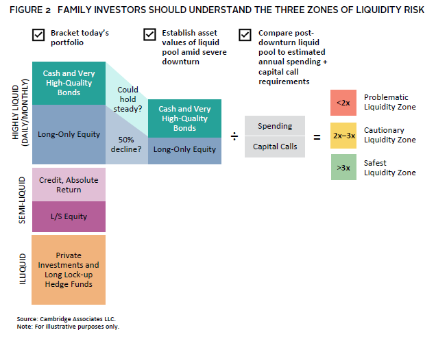 Investors can apply various rules to maintain a prudent level of liquidity, such as ensuring that cash and fixed income total at least two years’ worth (or similar) of estimated spending and capital calls. Portfolios should be stress tested periodically to ensure that portfolio liquidity remains adequate across a range of potential market environments. If this stress testing reveals a potential liquidity mismatch, families can take action before an actual market sell-off occurs, thereby helping to decrease their risk of capital loss (Figure 2).
