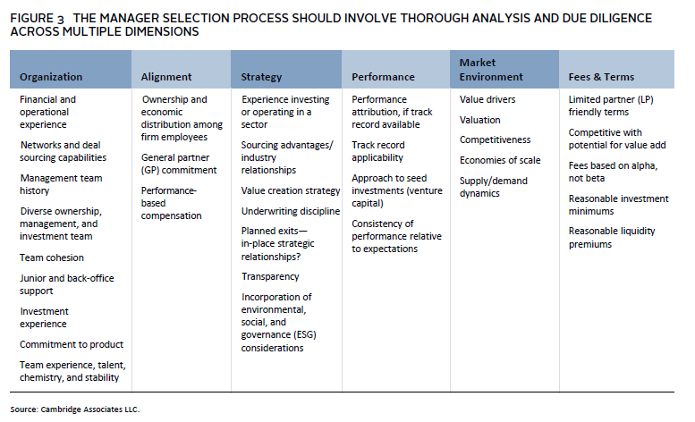 If a family chooses to invest with active managers, manager due diligence, selection, and monitoring will be key areas of focus. In the due diligence phase, investors will need to gain comfort with a manager’s investment strategy, investment team, strategy for generating outperformance, and portfolio and risk management abilities. In addition to thorough investment due diligence, investors must evaluate the organization and assess potential operational risks (Figure 3).