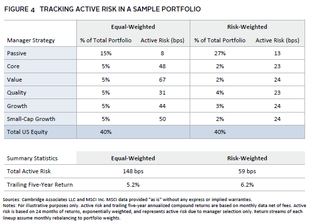 Regular analyses of a portfolio’s active risk should be conducted across all regions and asset classes. As an example, Figure 4 details a US equity manager portfolio that holds a passive index manager with limited active risk and four active satellite managers with significantly more active risk. The equal-weighted portfolio measures the four active managers equally by percentage of total portfolio. In this example, the risk-weighted approach instead attempts to equalize by active risk, resulting in a more optimal overall US equity portfolio that has higher trailing returns and lower active risk.