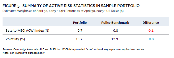 Additionally, measuring a portfolio’s volatility and sensitivity to market changes—its “beta” as compared to the “beta” of the policy benchmark—is essential to ensure the portfolio remains aligned with the intended risk level (Figure 5). If a portfolio, for instance, has a beta of 0.7 compared to a policy benchmark beta of 0.8, it may be “under risked” and may have to rely heavily on outperformance of its managers to match the return of the policy benchmark in a rising market—a big ask of active management. Conversely, if the portfolio beta is significantly higher than the policy beta, the portfolio may be exposed to larger potential drawdowns and higher volatility.