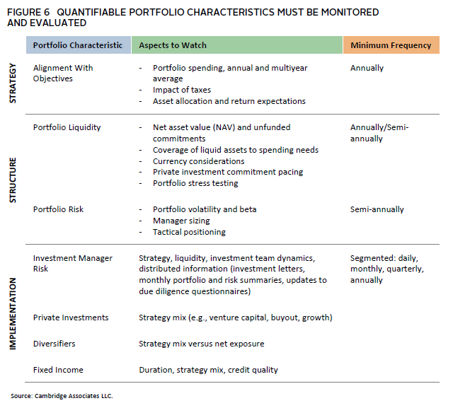 Portfolio monitoring is the unsung hero of risk management. It involves systematically reviewing each of the elements of the risk management framework a family has developed to ensure ongoing sound management of the portfolio. Whether you have a long lived or newly formulated investment strategy and implementation plan, their effectiveness over time will correlate directly to how well each is monitored on a yearly, quarterly, and daily basis (Figure 6). An investment portfolio is a complex machine—proactive observation is vital to ensuring it functions successfully.