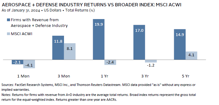 Divestment narrows the investment opportunity set and introduces new trade-offs. In addition to the elimination of certain direct investments, the divestment decision may steer the portfolio away from asset managers that do not screen for the excluded investments. The divested assets may ultimately become less favorable holdings because of growing pressure to move away from the goods and services involved in the conflict. Or they may be profitable endeavors, and, as a result of divestment, the institution chooses not to participate in financial gains. For example, firms with sales generated in aerospace and defense outperformed the broader index of stocks over the past five years.
