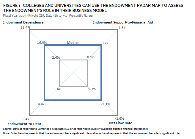 Endowment Radar brings together analysis of several financial metrics that can and often do change from year to year. Reviewing these results helps to manage with an eye toward future risks that may impact investment markets and university operations, including inflation, interest rates, and demographics. Evaluating these metrics and the role of the endowment in supporting colleges and universities during these tumultuous times helps to support near-term and long-term decisions and strategies.