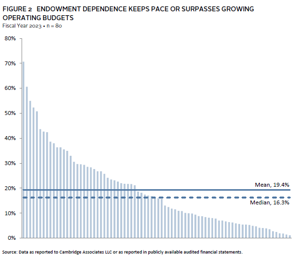Levels of endowment dependence vary across the 80 colleges and universities in the 2023 Endowment Radar Study. Endowment support ranges from a small fraction of the university budget to supporting more than half (Figure 2).