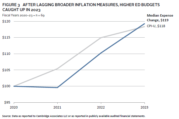 The median level of endowment dependence was 16.3% in 2023, which was similar to 2021 and higher than 2022 (14.1%). This year’s growth in endowment dependence is notable, given the significant growth in operating budgets that the endowments are supporting. For the median institution, the growing level of endowment support was driven by a 10.5% increase in endowment distribution, which outpaced the significant 8.3% growth rate of expenses. For the colleges and universities in our study, expense growth outpaced broader inflation 2 in 2023, but kept pace with recent trends, as higher education costs caught up with broader inflation growth over the past three years (Figure 3).