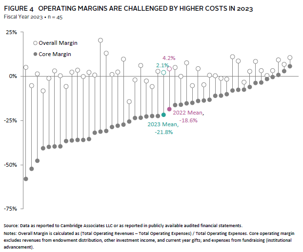 Revenues also increased in 2023, but the 6.3% median revenue increase did not keep pace with the 8.3% growth in expenses. This dynamic is demonstrated in slightly narrower operating margins (Figure 4). On average, core operating margins before endowment and gift subsidies were more negative (-21.8% in 2023 versus -18.6% in 2022). The median overall margin finished positive but had less cushion (2.1% in 2023 versus 4.2% in 2022). The number of institutions completing the fiscal year with a negative margin more than doubled in 2023, indicating the challenging financial environment for many.