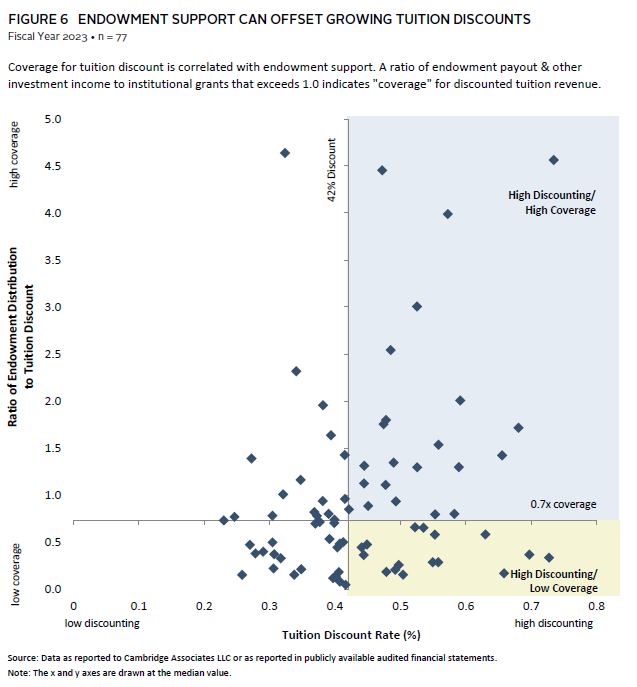 The institutions that have endowment “coverage” for financial aid can offset forgone tuition revenue with endowment spending (Figure 6). This enables them to deliver their discounted price to students from a position of strength as shown in light blue shading in the upper-right quadrant. The colleges and universities in yellow shading on the lower-right side are offering high discount rates, but from a weaker financial position. Without a higher subsidy from the endowment to offset this forgone revenue, they will need to employ other financial levers—such as auxiliary revenue, annual fund gifts, and careful expense management—to fund these commitments and balance the budget.