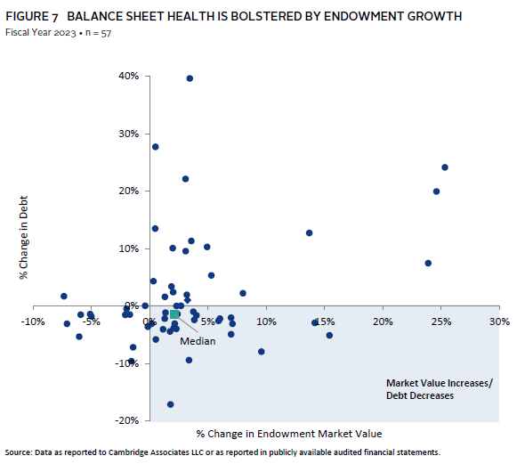 Endowments provided an important ballast to the private college and university business model in 2023. For many the institutions, higher costs and financial aid commitments were accompanied by growing endowment market values. Greater endowment dependence was fueled by higher rates of spending. Balance sheet health improved for the majority of institutions.
