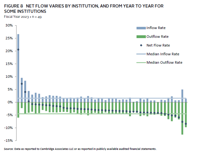 Net flow is a metric that tends to vary considerably by institution, and from year to year for some institutions, because it is sensitive to cash flow timing and the unanticipated event, such as the gift of a large bequest (Figure 8). The calculated rate is also sensitive to the beginning endowment market value, which is the ratio’s denominator. In 2023, there were more negative net flow rates, driven by higher rates of spending.