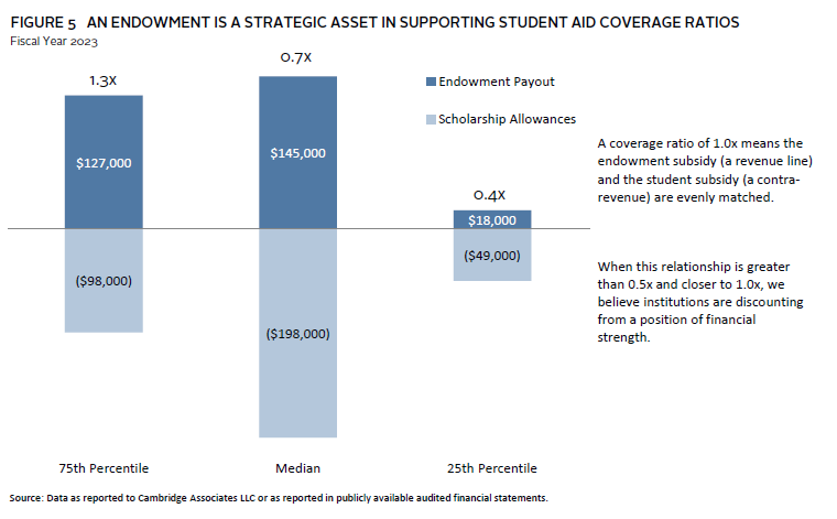 - The endowment maintained the level of coverage of growing financial aid commitments. Endowment distributions represented 0.7x coverage of tuition discounts.
