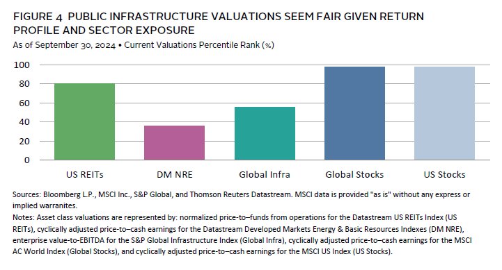 Public infrastructure equities have posted mid-single-digit annualized returns in recent years (Figure 3). The asset class has performed similar to most real assets peers but with more consistency, given the higher return contribution from dividends. Year-to-date performance has been stronger as interest rate cuts have again piqued investor interest in the sector’s steady dividend stream. Not all funds have done well. Some previous projects have suffered from higher-than-expected financing costs and some have had sector-specific issues, such as the struggles of European utilities. Public infrastructure indexes have also not enjoyed the same performance uplift as private equivalents, given their lack of exposure to recent winners like digital infrastructure. Still, despite strong recent returns, valuations look attractive relative to both other real assets categories and broad equity markets (Figure 4).