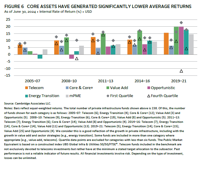 In contrast, returns for private infrastructure assets have been strong in recent years and compare favorably with those of other real assets (Figure 5). Across categories, core assets have generated significantly lower average returns (Figure 6), reflecting their lower risk profile while also increasing competition. Returns for more value-add and specialized categories have been significantly higher. This is especially true for energy transition funds in recent years, reflecting the maturation of technologies (e.g., renewables) from earlier funds that tended to underperform, as well as the green premium for such assets being offered recently. Digital-focused strategies have also significantly outperformed, benefiting from market growth.