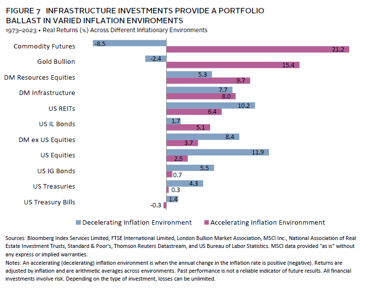 Infrastructure investments can also help reduce overall portfolio volatility. Given their ability to post steady returns across various economic environments, infrastructure assets can aid in stabilizing overall portfolio performance. Demand for services like toll roads and power tends to be recession resistant and providers (often protected by long-term contracts) can pass inflationary pressures to end-users, supporting returns on capital. Figure 7 illustrates how infrastructure investments provide a ballast to portfolios by generating attractive real returns in both rising and falling inflation environments. In fact, the consistency of their returns across these environments suggests they are better suited to cushion portfolios against both inflationary and deflationary shocks.