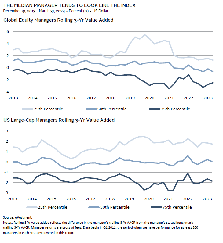The median manager has delivered rather pedestrian returns in excess of its benchmark, but there are plenty of managers that have delivered meaningful excess returns over time. More specifically, since 2011, 1 the median global manager has delivered an average, gross of fee, rolling three-year excess return of 0.6% and the median US large-cap manager has fared even worse at -0.1%. Taxable investors require even higher returns to outperform the market net of fees and taxes as index funds tend to be more tax efficient than active managers. For such investors, we lean into tax-efficient managers that can also harvest losses and generate “tax alpha.” In short, to earn excess returns of 30 basis points (bps) to 40 bps net of fees requires finding managers well into the top half—closer to the 35th percentile for US large caps and 45th percentile for global equities.