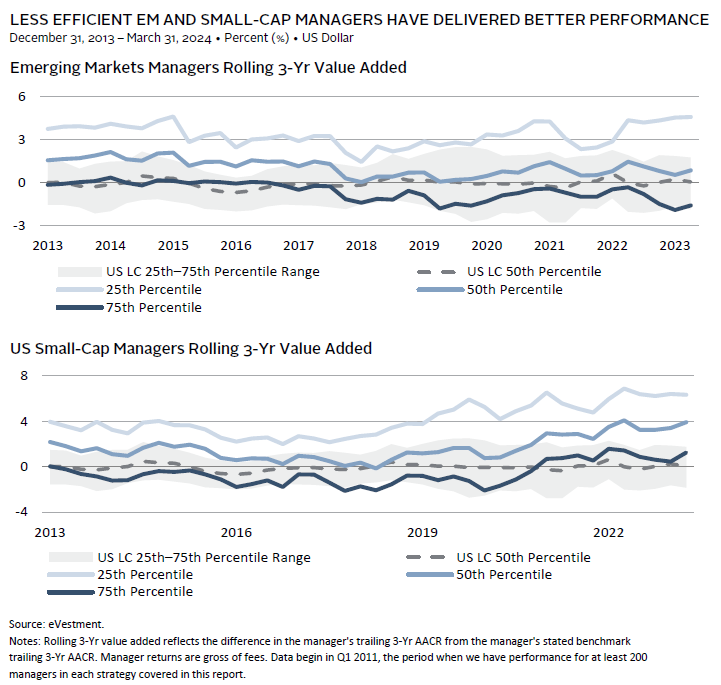 Managers trafficking in less efficient markets (whether that means less in the way of sell-side coverage, buy-side product offering, or tech-enhanced transparency), such as small caps and emerging markets, have fared better over time. The following data show that in contrast to more efficient US large-cap equity managers, the median manager in such strategies has offered value even after fees, with the average of rolling three-year, gross value–added returns of 1.4 percentage points (ppts) for US small-cap managers and 1.1 ppts for emerging markets managers.
