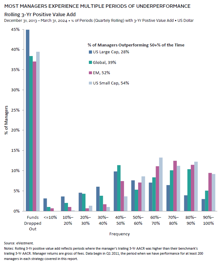 Identifying managers that can outperform the market is challenging because those that outperform during one period do not always repeat this feat. Indeed, most managers reporting performance at the start of 2011 either underperformed their benchmark during the majority of rolling three-year periods or stopped reporting, which typically happens due to liquidation, mergers, or poor performance.