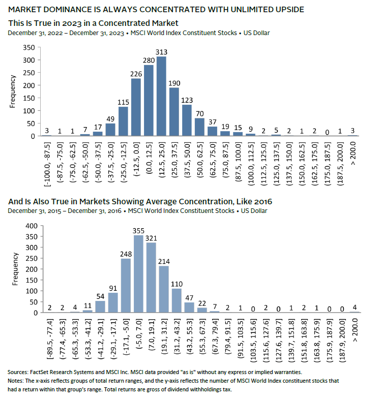 Concentration of outperformers doesn’t pose a significant challenge to active managers when the best performers have low index weights, but when they are concentrated in the largest stocks—as they have been in recent years—the index is a particularly tough bogey to beat. For example, in 2023, the number of stocks outperforming the S&P 500 Index was unusually low (29% versus a median of 49%) and gains were highly concentrated in a handful of mega-cap stocks, with the top ten companies contributing 62% of the index’s return. Concentration in the top ten stocks for MSCI ACWI last year, however, stood at 42%, and the share of stocks outperforming fared slightly better at 34%. Over a longer-term period, the global index has a higher share of outperforming stocks with a median of 50%.