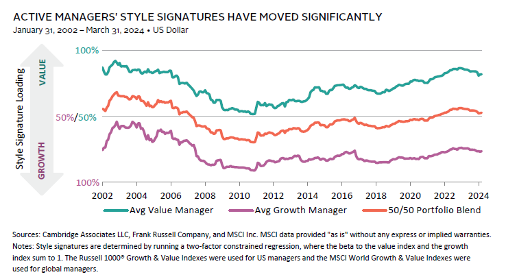 A key challenge in building portfolios of active managers is avoiding unintended bets as a byproduct of manager selection, given their underlying exposures tend to drift over time. Manager exposures shift across the capitalization and factor spectrum (e.g., value, quality, momentum) as well as geographic, economic sector, and currency exposures. The following figure shows how the average growth and value manager’s style characteristics tend to shift over time. 4