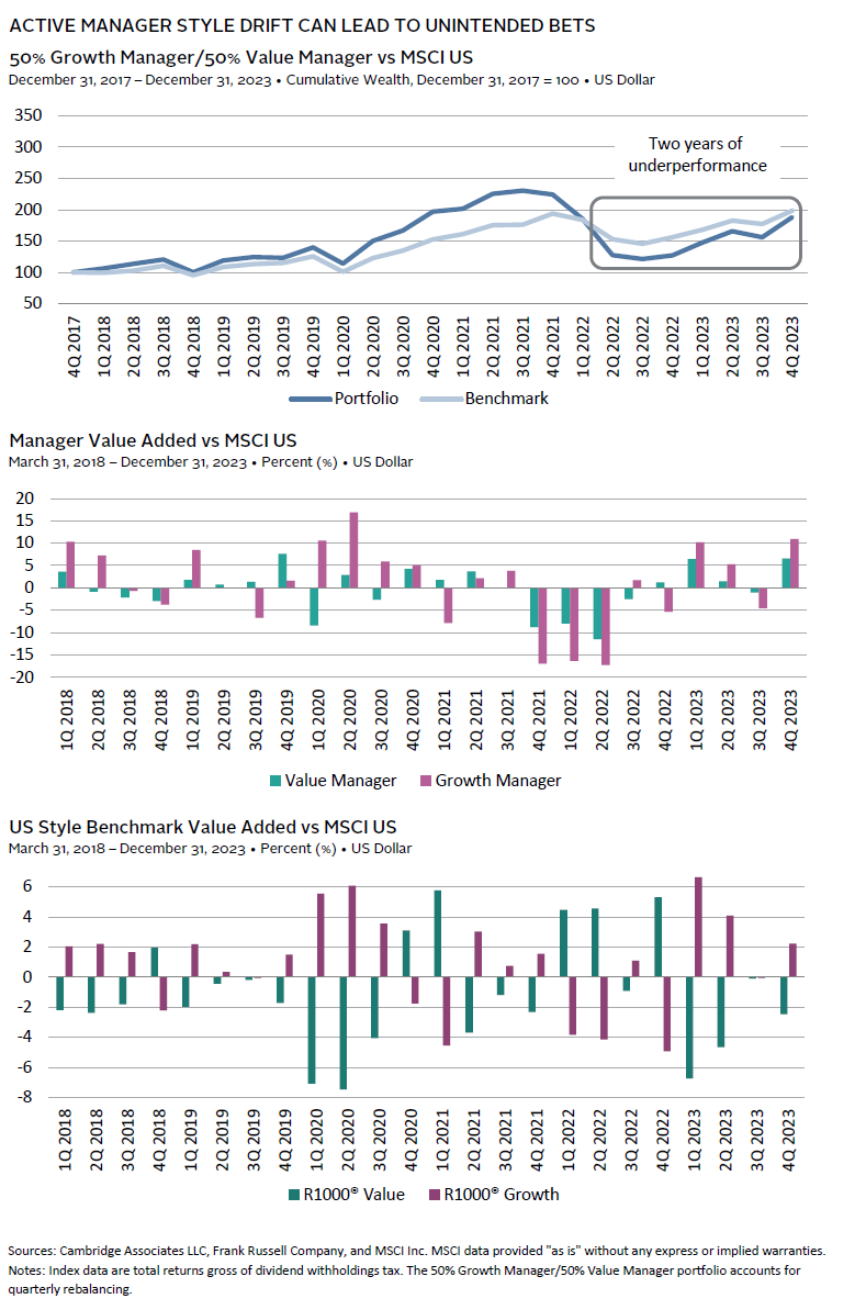 The ongoing drift in manager factor exposures creates portfolio construction challenges that can be as important as manager selection. A simplified case study will help illustrate the challenge. Consider a US equity portfolio benchmarked to the MSCI US Index and consisting of an equal-weighted allocation to two managers—a growth manager and a value manager. On initial inspection, it appears they are well balanced, meaning that their combined style exposure would mirror that of the MSCI US Index. Yet in 2021, the value manager drifted to growth as growth outperformed. Once 2022 brought rising interest rates that killed the growth rally, both the growth manager and the value manager underperformed the broad market even as the value-style benchmark outperformed. The result was 18.4 ppts of cumulative US equity underperformance for 2022 and 2023. While an extreme example, given the unusually sharp shift from growth outperformance to value outperformance over this period, this case study illustrates the challenge investors have in managing portfolio exposures and the requisite risk management.
