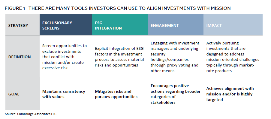 Mission alignment is a blanket term that describes incorporating objectives from an institution’s mission into investment decision making. There are many tools investors can use to align investments with mission. The field of sustainable and impact investing has evolved over the years from values-based exclusions to holistic incorporation of financially material risks and opportunities, often associated ESG factors (Figure 1).