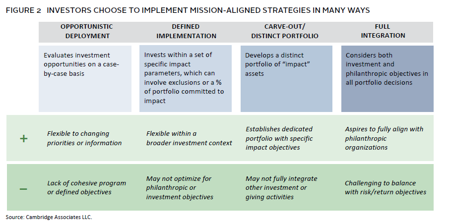 There are also degrees of adoption when it comes to implementation. Alignment can be integrated across the entire endowment, as a “carve-out” within the endowment, or as a carve-out outside the endowment (Figure 2).