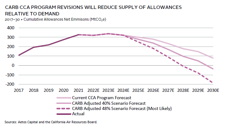 Cap-and-trade programs seek to reduce carbon emissions by putting a price on carbon and requiring covered entities to purchase allowances to offset emissions. The most attractive time to invest in these markets has been as supply starts to fall short of demand, pushing up prices. The California cap-and-trade program budgets a 4% annual CCA supply reduction. CARB’s review revealed that it would need to reduce CCA supply by 7.7% annually from 2025–30 to meet its current 2030 emissions reduction target of 40% relative to 1990. Should CARB raise the bar to a 48% reduction, as some analysts think is likely, supply would need to fall by 11.1% a year.