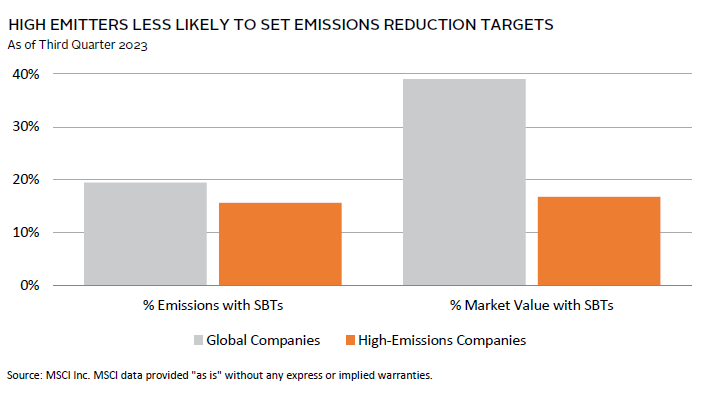 The aggregate data are striking: 39% of MSCI ACWI market value is represented by companies that have set SBTs, but these companies represent only 19% of index emissions. The vast majority (81%) of emissions come from companies with no plans to align with net zero. We, therefore, expect to see investors increasingly prioritize persuading their highest emission holdings to adopt SBTs.